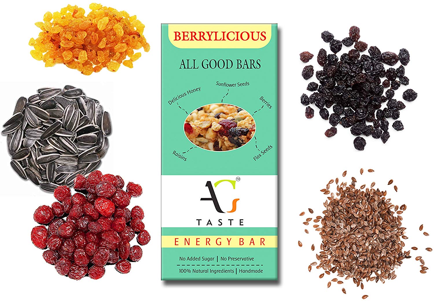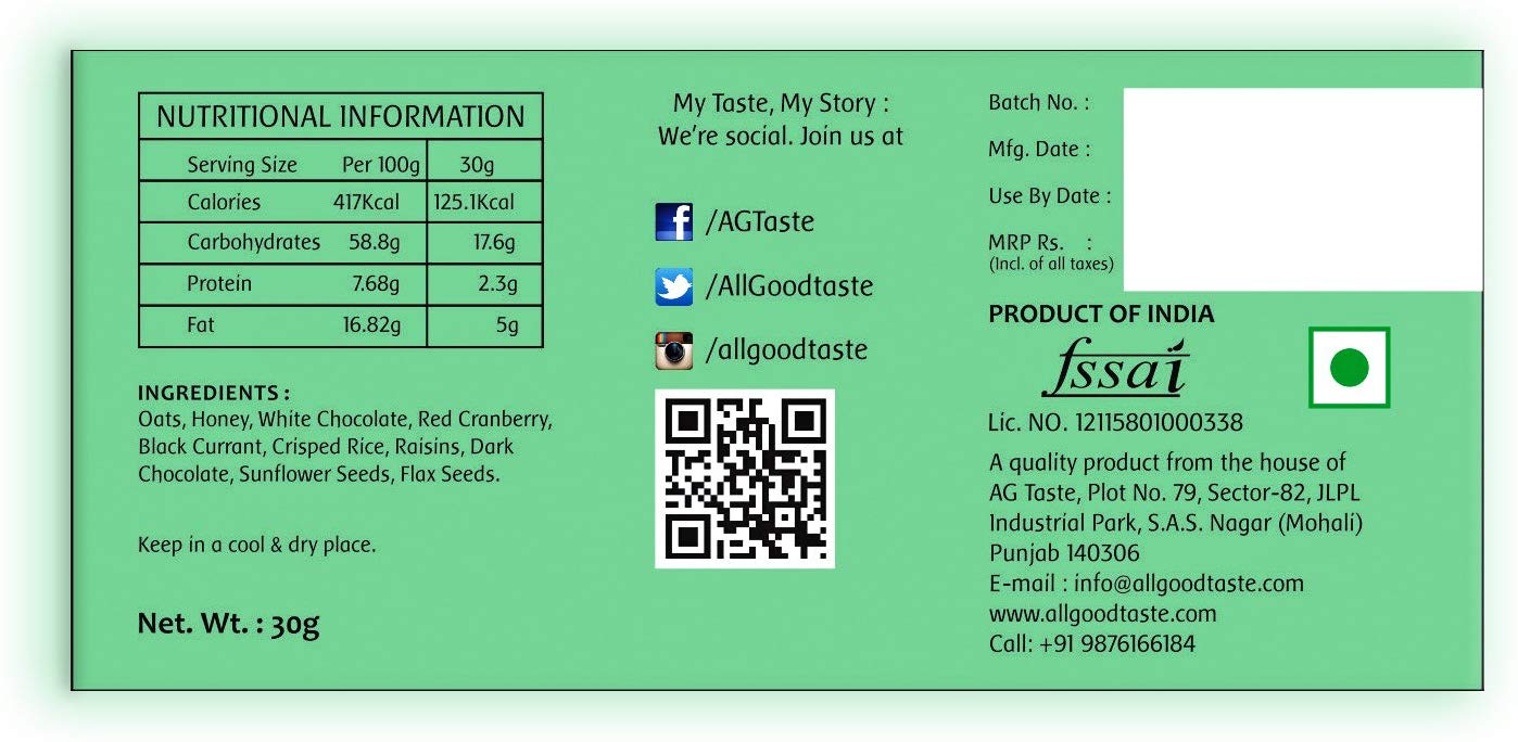 A zesty mixture of golden raisins, red cranberries, black currants and chocolate bound in honey and oats for a snack that satisfies from the first bite till the very last. No added sugar or preservatives.