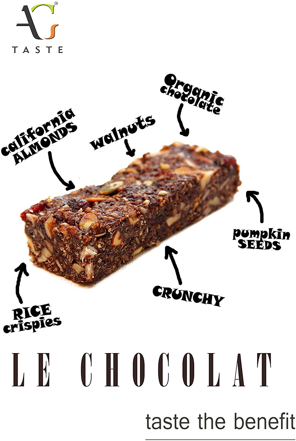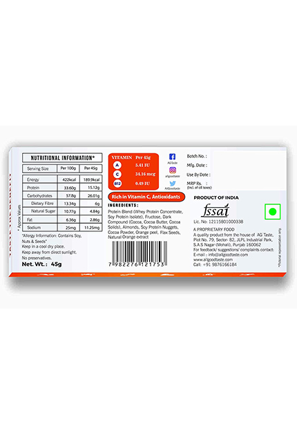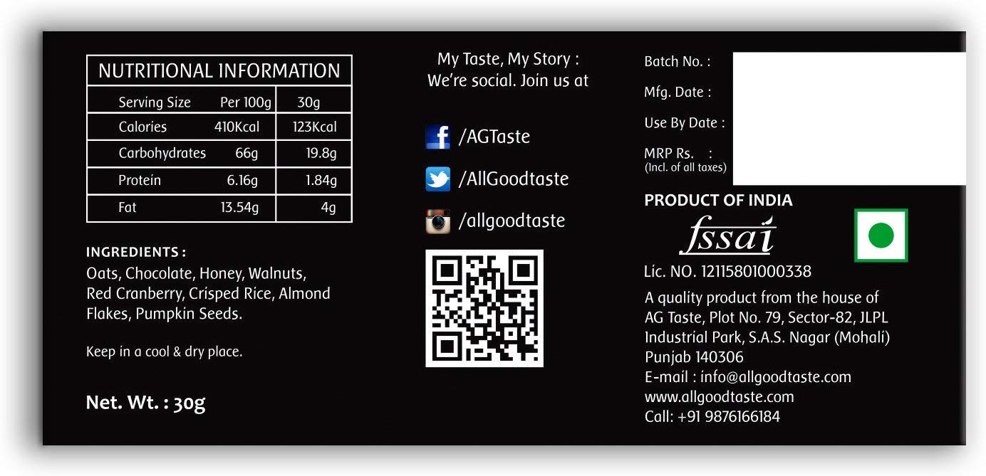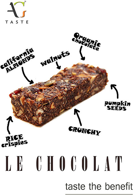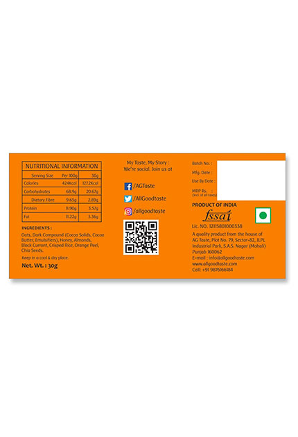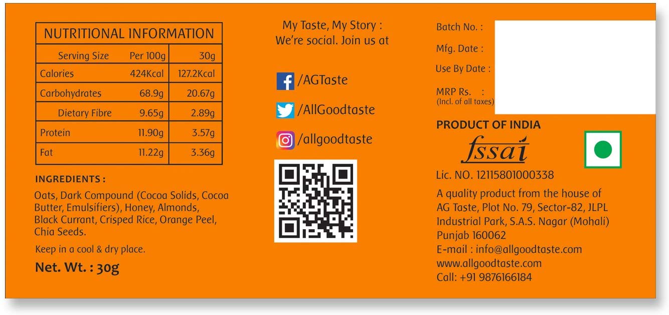 Zesty mixture of Almonds, Chocolate, Black Currants, Crisped Rice, Orange Peel and Chia Seeds bound in honey and oats for a snack that satisfies from the first bite till the very last..