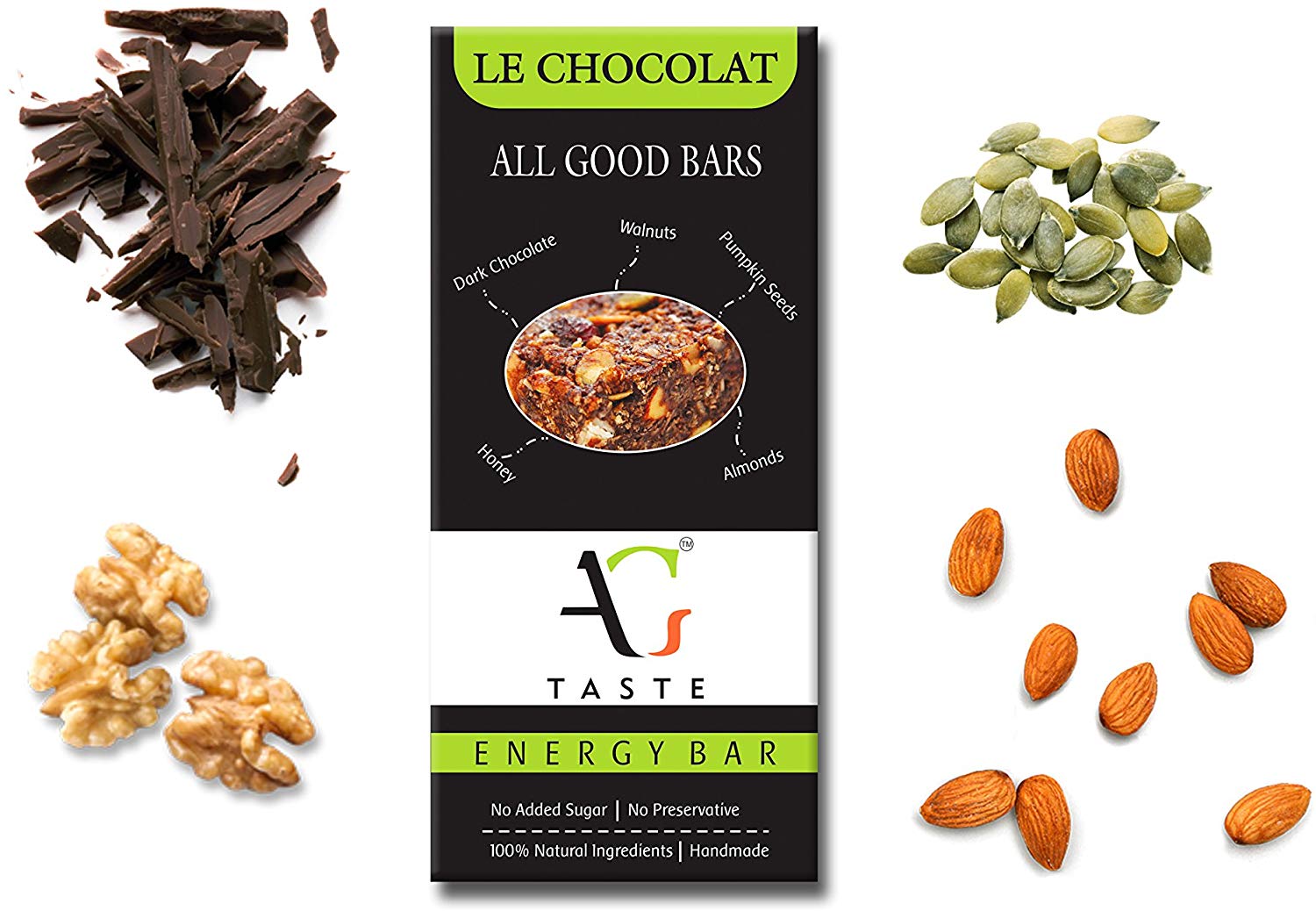 Made of dark organic chocolate, sun kissed California almonds, walnuts and rolled oats mixed with the natural goodness of honey. No added sugar or preservatives.